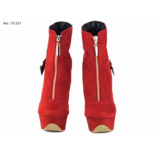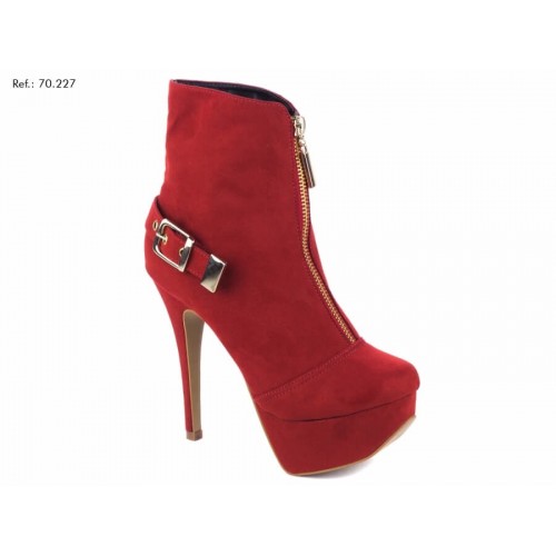Bota cano curto com meia pata feminina, material sintético na cor vermelho, enfeite com fivela na cor dourado, fechamento de zíper na parte frontal na cor dourado, meia pata externa encapada na cor vermelho, salto encapado em material sintético na cor vermelho e com 13 cm de altura, sola emborrachada na cor bege.
