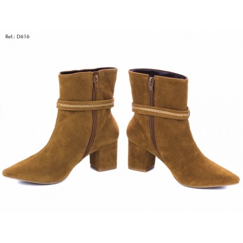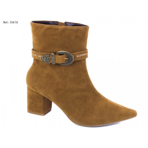 Bota cano curto feminina com bico fino, material em sintético na cor caramelo, enfeite lateral de fivela na cor ouro velho fechamento de zíper na parte interna na cor caramelo, para maior conforto o forro é espumado na cor marrom, salto montaria em material sintético na cor caramelo e com 6 cm de altura, sola emborrachada na cor bege.