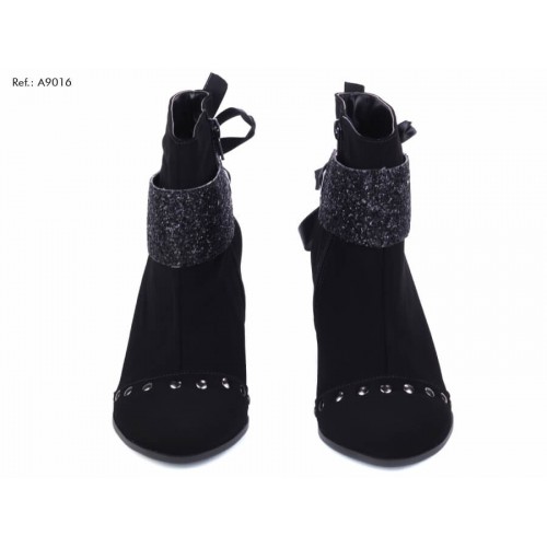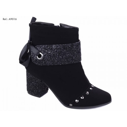 Bota feminina cano curto, material sintético nas cores preto e brilho, fechamento por zíper na parte interna na cor preto, enfeite de tachas na parte frontal na cor prata velho, salto encapado em material sintético na cor preto com brilho e com 6,5 cm de altura, sola emborrachada na cor preto.