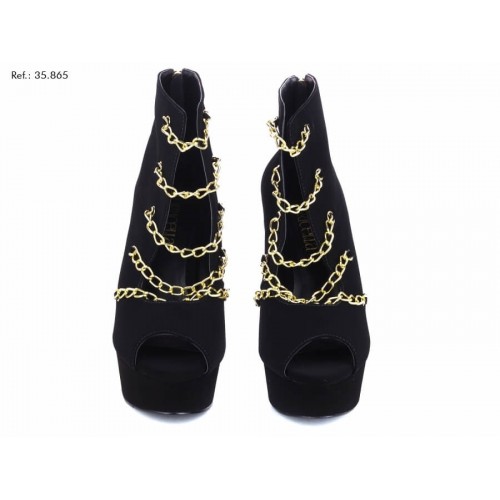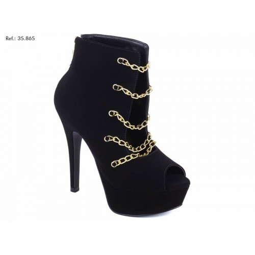 Bota meia pata feminina, material sintético na cor preto, enfeite de correntes na parte frontal na cor ouro light, fechamento de zíper no traseiro cor ouro light, palmilha encapada na cor preto, com taloneira na cor preto, meia pata externa na cor preto, salto encapado em material sintético na cor preto e com 13 cm de altura, sola emborrachada na cor preto.