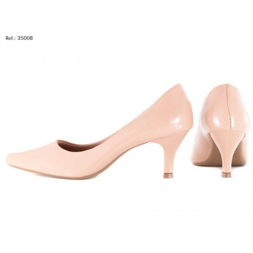 Sapato Scarpin feminino, material sintético verniz na cor rosê, para maior conforto o forro é espumado na cor bege e taloneira na cor caramelo, salto encapado em material sintético na cor rosê e com 6 cm de altura, sola emborrachada na cor bege.